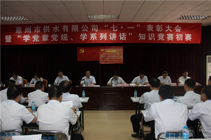 7月1日,市供水公司召开“七一”表彰大会暨“学党章党规、学系列讲话”知识竞赛初赛,以新党员入党宣誓及老党员重温誓词、表彰先进、开展“两学一做”专题党课和知识竞赛的方式,隆重庆祝中国共产党诞辰95周年。
