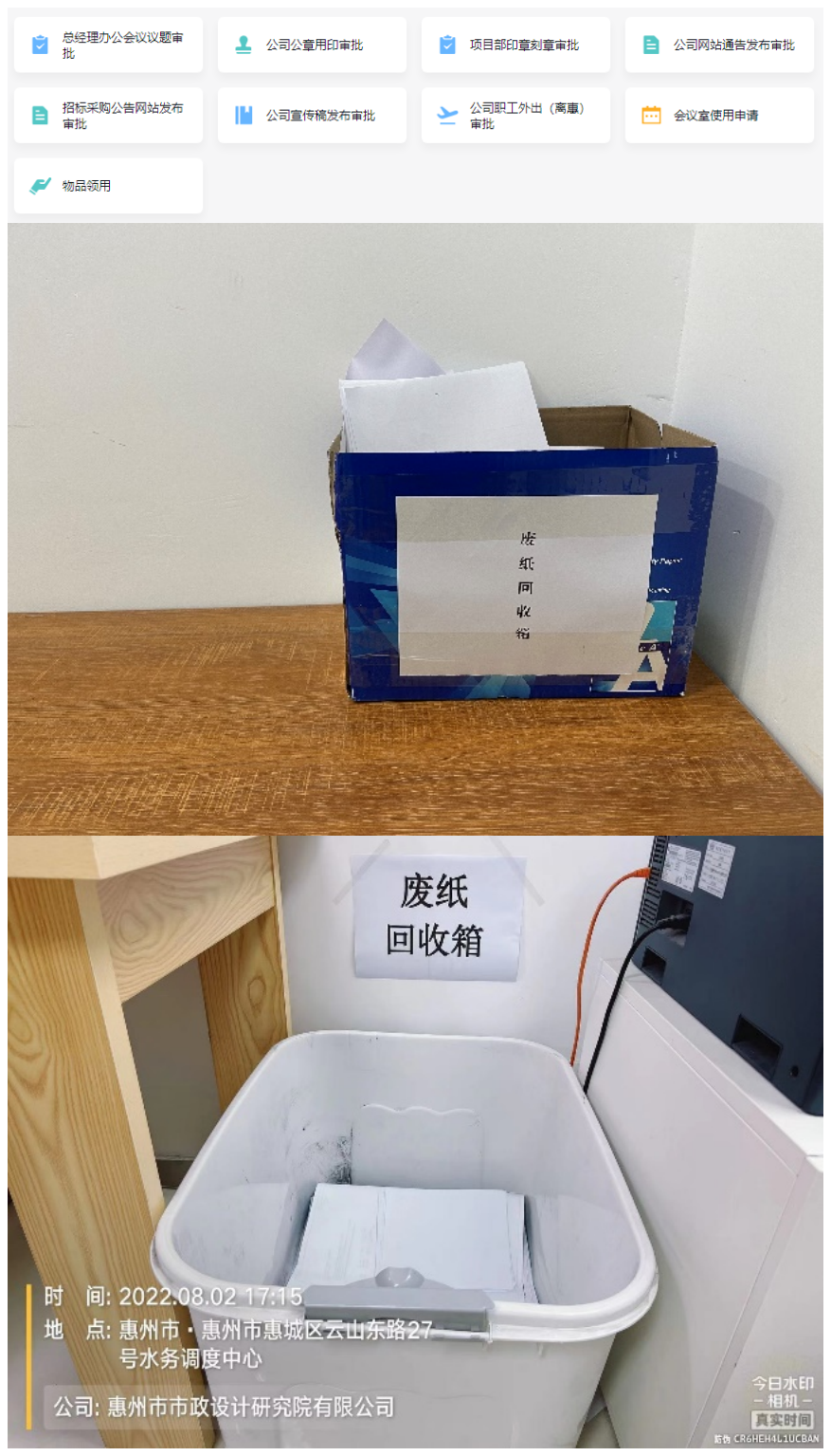 倡导无纸化办公,各项审批工作能通过线上审批不使用纸质审批表;资料文件双面打印,通过废纸回收箱收集打印废纸,废纸用作草稿纸实现废纸再利用。