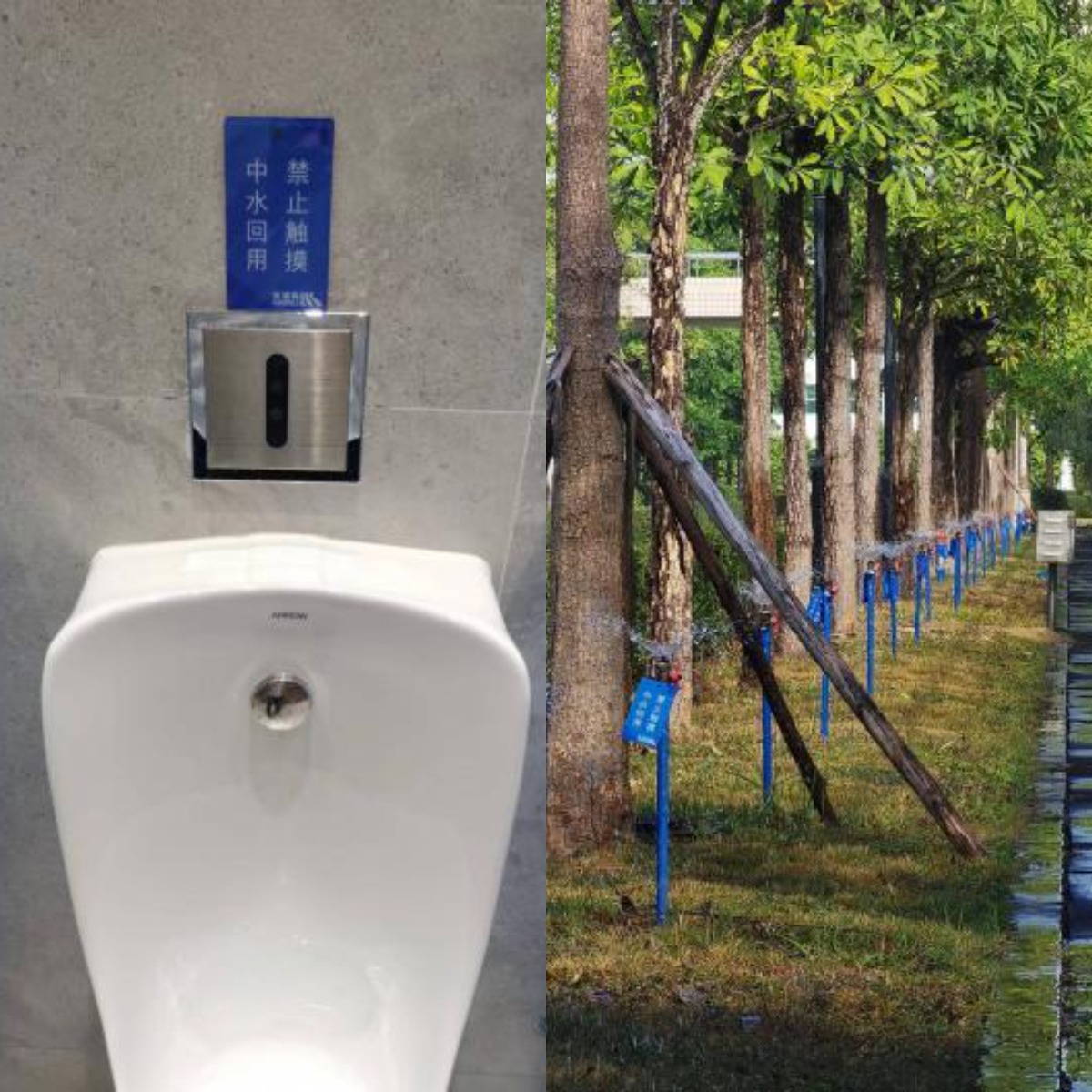 使用中水回用设备,利用中水进行冲厕及绿地浇水,绿色用水。