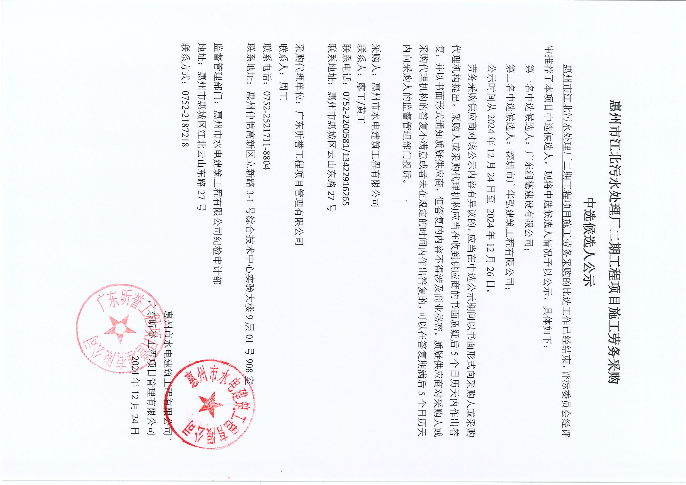 惠州市江北污水处理厂二期工程项目施工劳务采购中选候选人公示