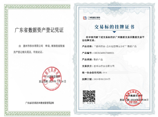 数据要素取得突破:首款供水数据产品成功通过广州数据交易所审核,荣获数据资产登记凭证,标志着市供水公司成为广东省首家完成数据产品挂牌交易的供水企业。此外,该产品也顺利完成了数据资产财务入表工作,成为惠州市国资系统第一家利用企业自有数据完成数据要素入表的国有企业。