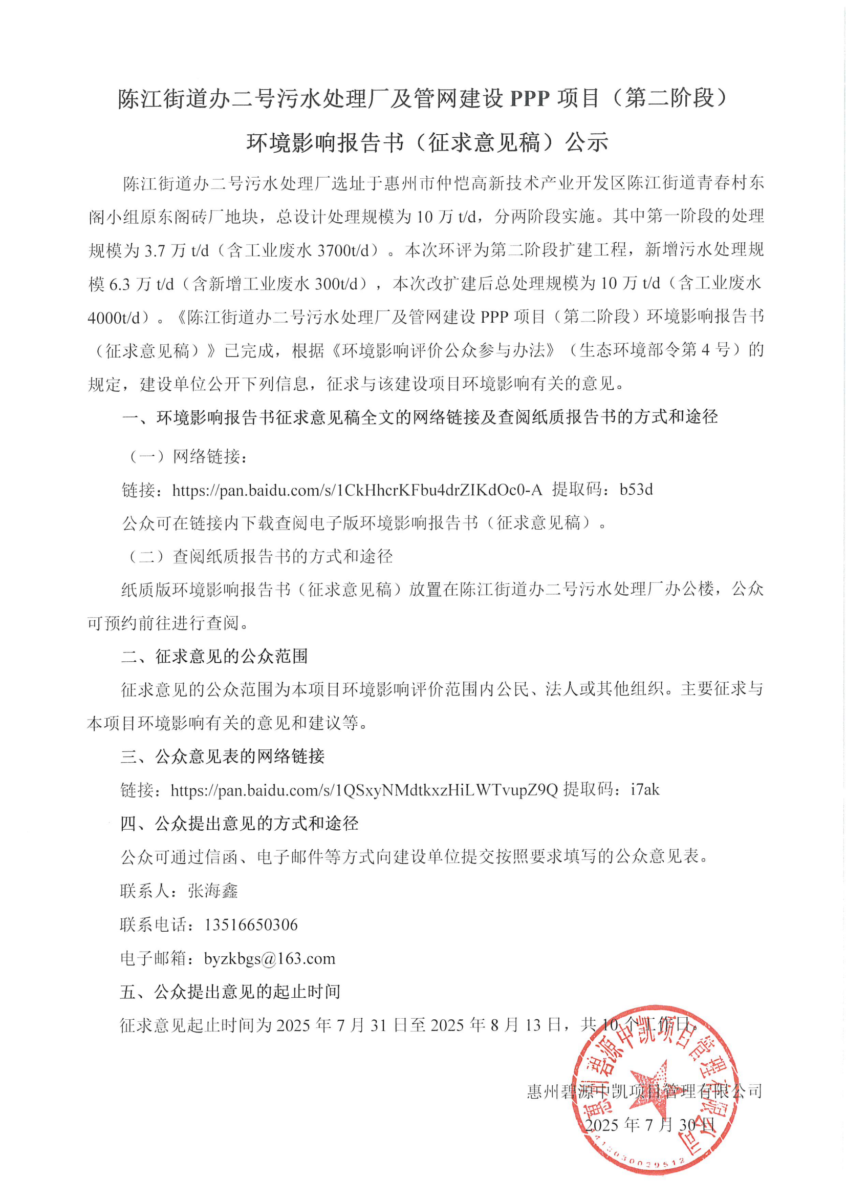 陈江街道办二号污水处理厂及管网建设PPP项目(第二阶段) 环境影响报告书(征求意见稿)公示