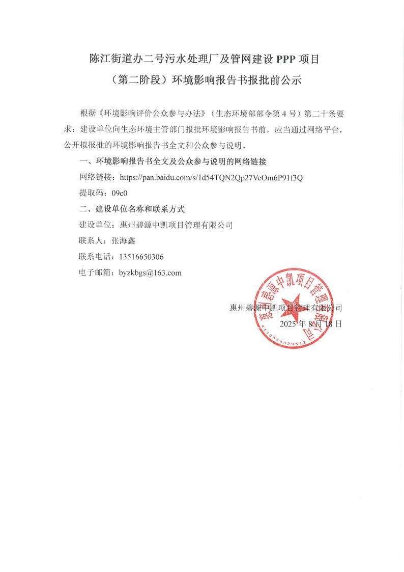 陈江街道办二号污水处理厂及管网建设PPP项目(第二阶段)环境影响报告书报批前公示