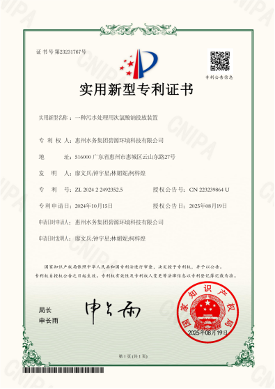 继连续斩获四项污水、污泥处理相关技术专利后,万币(中国)官方网站 碧源公司在水务环保技术创新领域再传捷报。8月19日,由碧源公司自主研发的“一种污水处理用次氯酸钠投放装置”荣获国家知识产权局授予专利权并颁发实用新型专利证书。至此,公司已在水务环保领域累计斩获五项国家授权专利,涵盖污水、污泥处理等多个关键技术环节。
