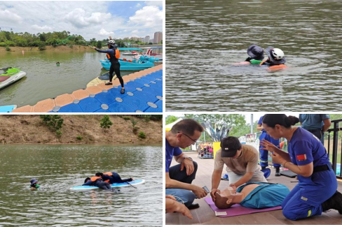 蓝天救援队结合近期发生的溺水和救援案例,现场拆解“黄金四分钟”,他们带领景区和经营业态工作人员分组练习,从清理呼吸道、开放气道到精准按压,逐一纠正手势偏差。全域覆盖从“专业队”到“全员兵”的安全共识。接着,桨板运动协会与蓝天救援队分别对桨板救援、绳包救援、徒手救援等进行了系统化的培训,景区内各业态的工作人员也积极地参与了救援实践的学习。
