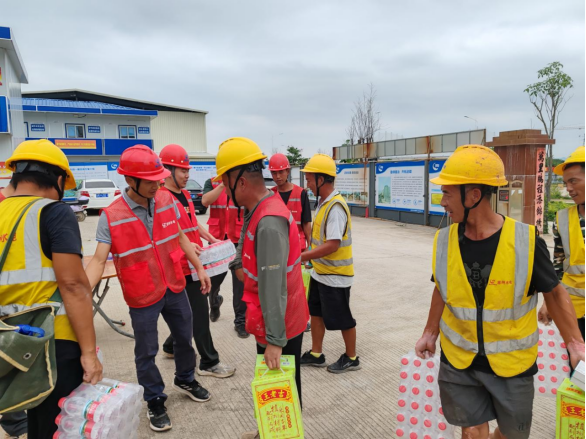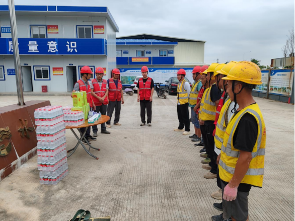 活动现场,临时党支部成员与项目部工作人员化身“清凉使者”,将藿香正气水、王老吉凉茶、矿泉水等防暑降温物资一一递到工人手中。“天气炎热,一定要注意防暑,合理安排作业时间!”他们一边发放物资,一边反复叮嘱工人们做好自我防护,科学调整作息,确保安全生产。接过物资的工人们脸上洋溢着笑容,纷纷对这份及时的关怀表示感谢。